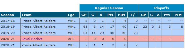 Malheureusement, il a manqué presque toute la saison 2020-2021 après avoir subi une blessure à une main lors de sa deuxième partie dans la WHL. Heureusement, ce type de blessure ne devrait pas laisser de séquelles à long terme.